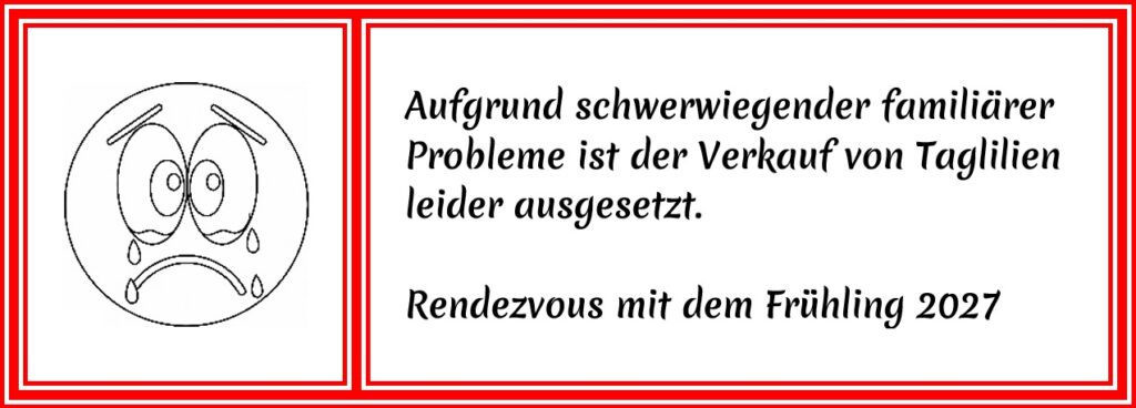 Die Taglilien sind jederzeit bis Ende September buchbar (dafür besuchen Sie bitte die Seite „Kontakt“). Der Versand erfolgt dann in dem für Sie günstigsten Zeitraum von Anfang September bis Mitte Oktober. Um die Taglilien zu reservieren, ist die Angabe folgender Daten erforderlich: